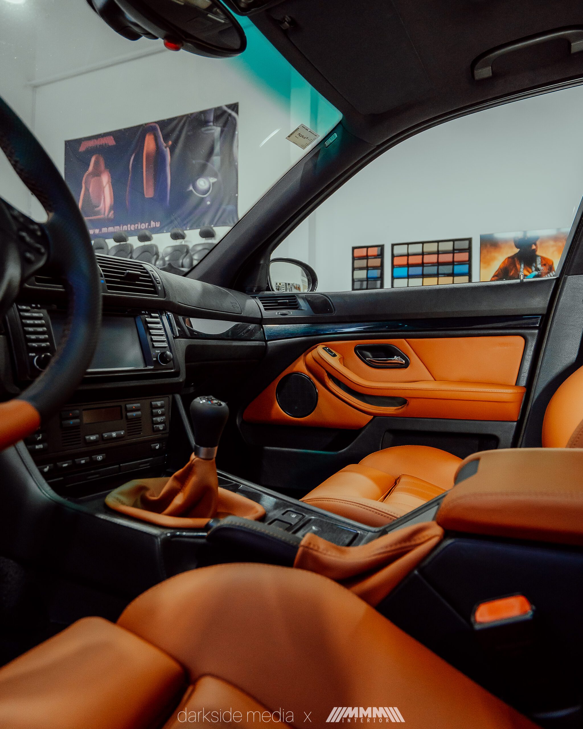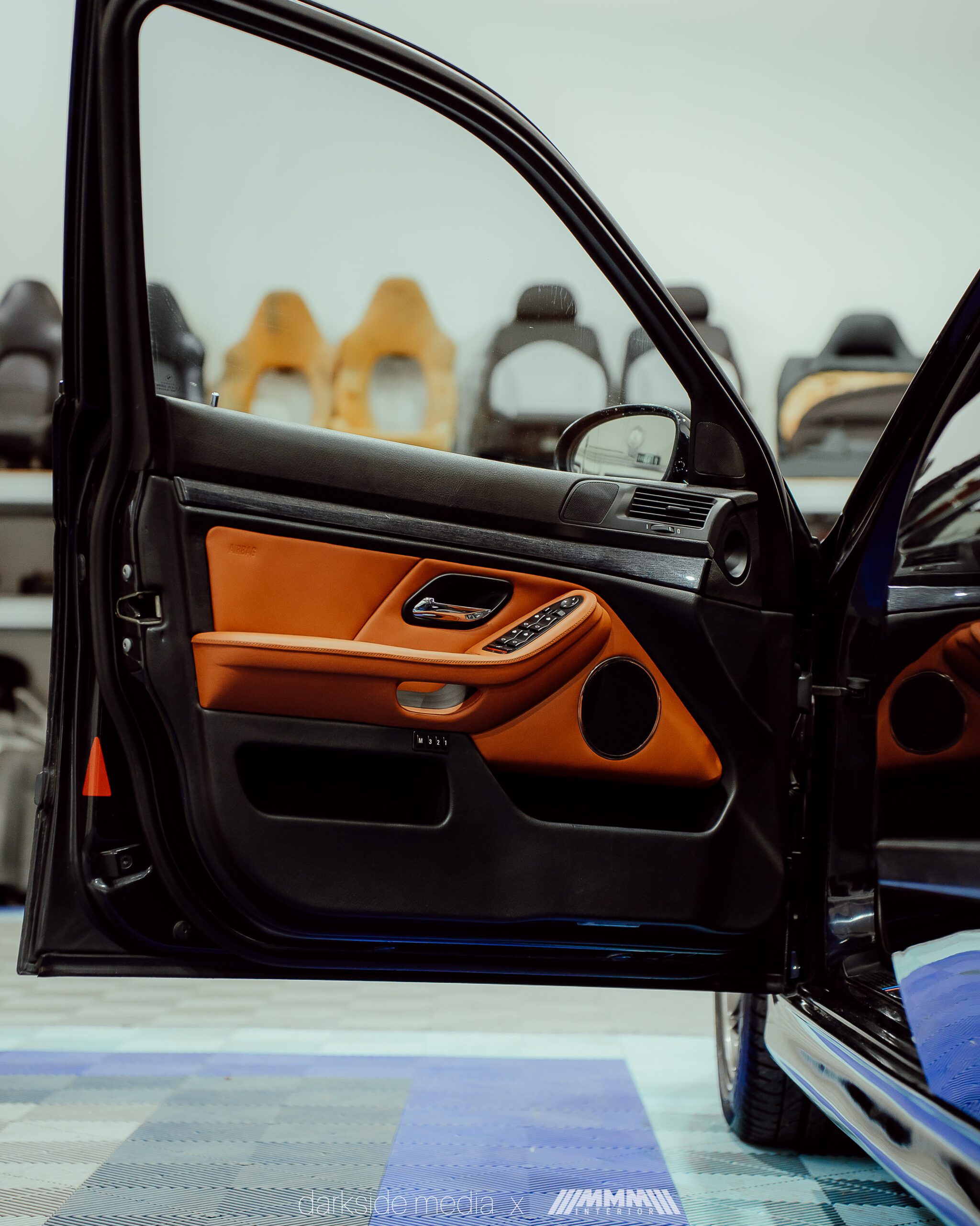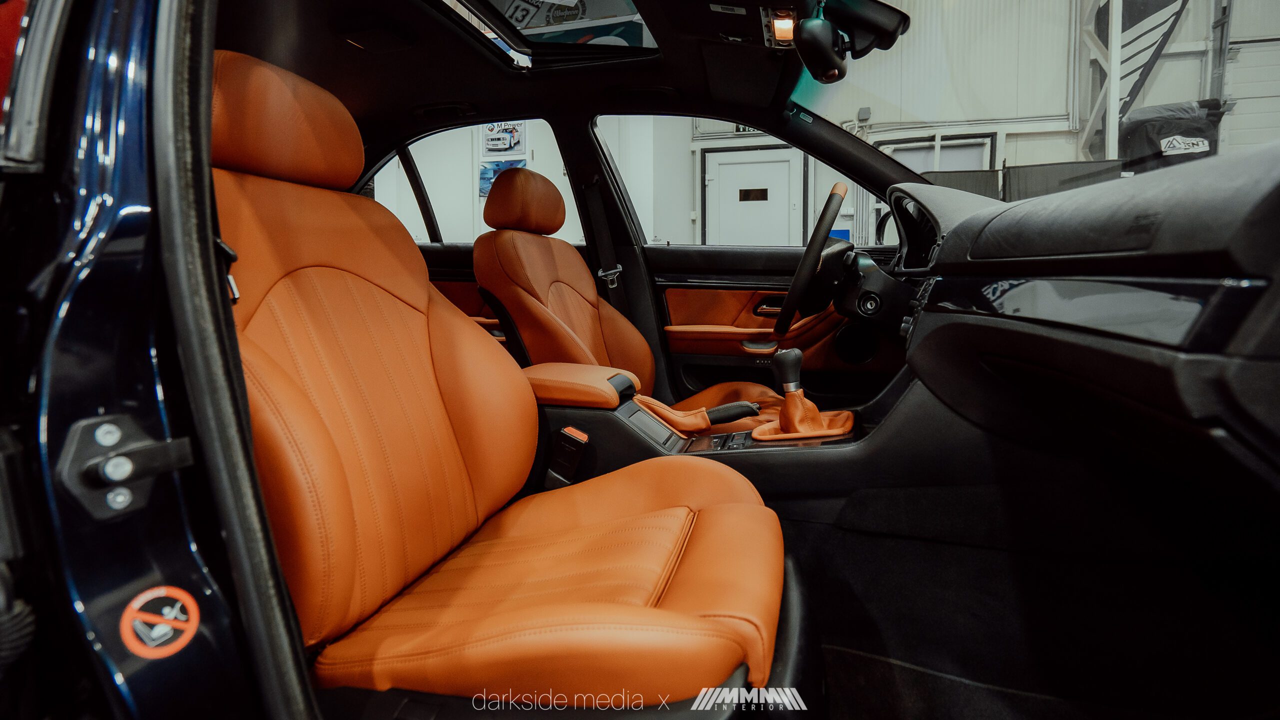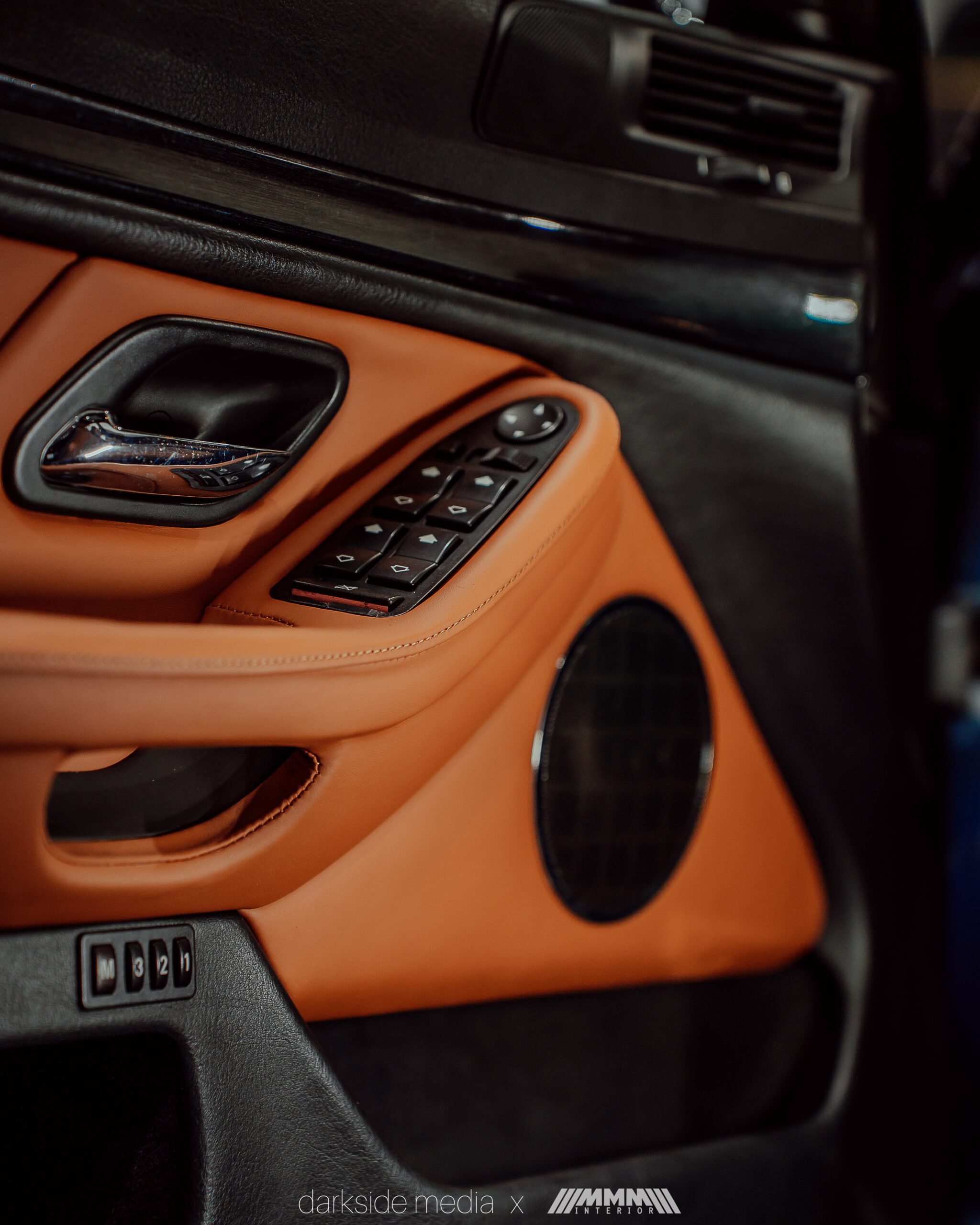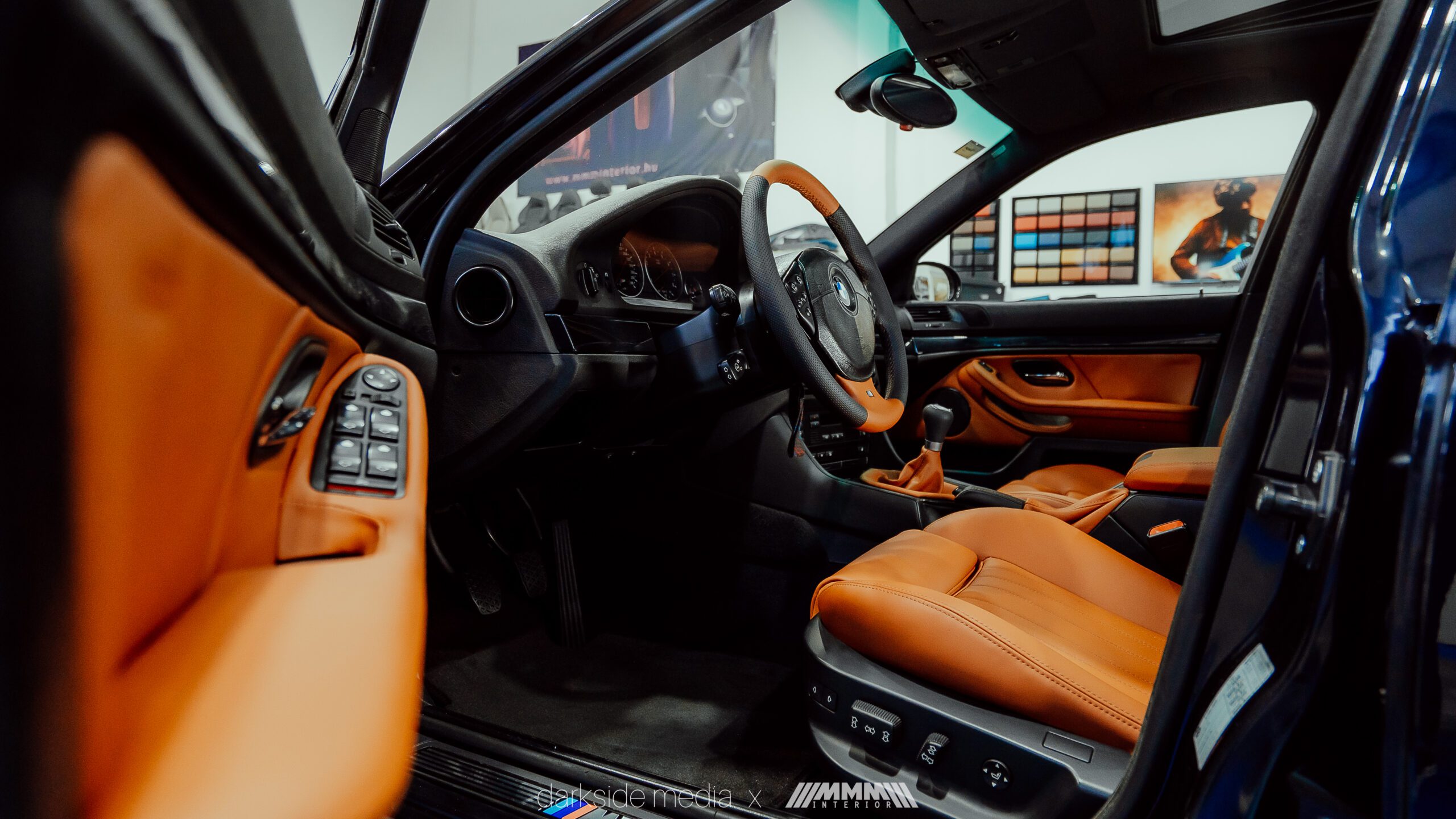 A carbonschwarz gyári fényezéssel tökéletesen harmonizál a gyári fahéj szín (természetesen nappabőr), de nem estünk túlzásba, azaz nem készült bővített bőrözés, “csak” az ülések, ajtókárpitok betétjei, a kormány és a váltózsák, könyöklő került újrabőrözésre. Sok apró típushibát is orvosoltunk egy teljes tisztítás mellett. Műszaki felújításon már átesett a gép, az utolsó lépés a fényezés korrekciója lesz, hogy egy újabb nagyon szép M5 kerüljön vissza az utakra.