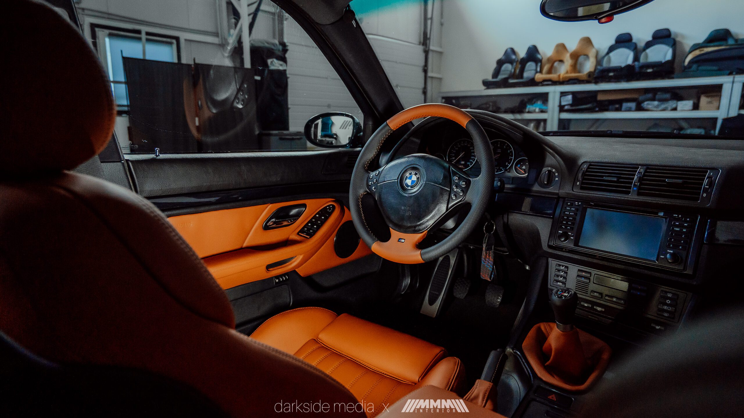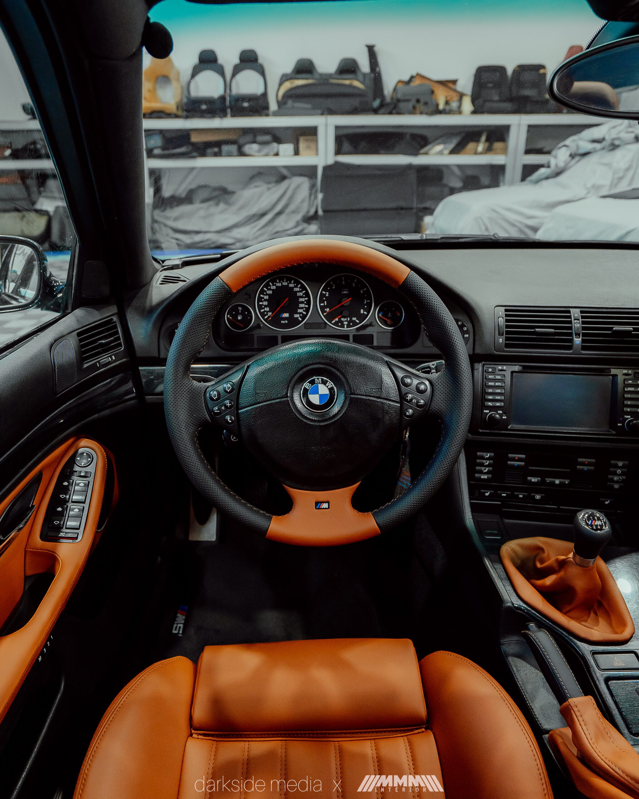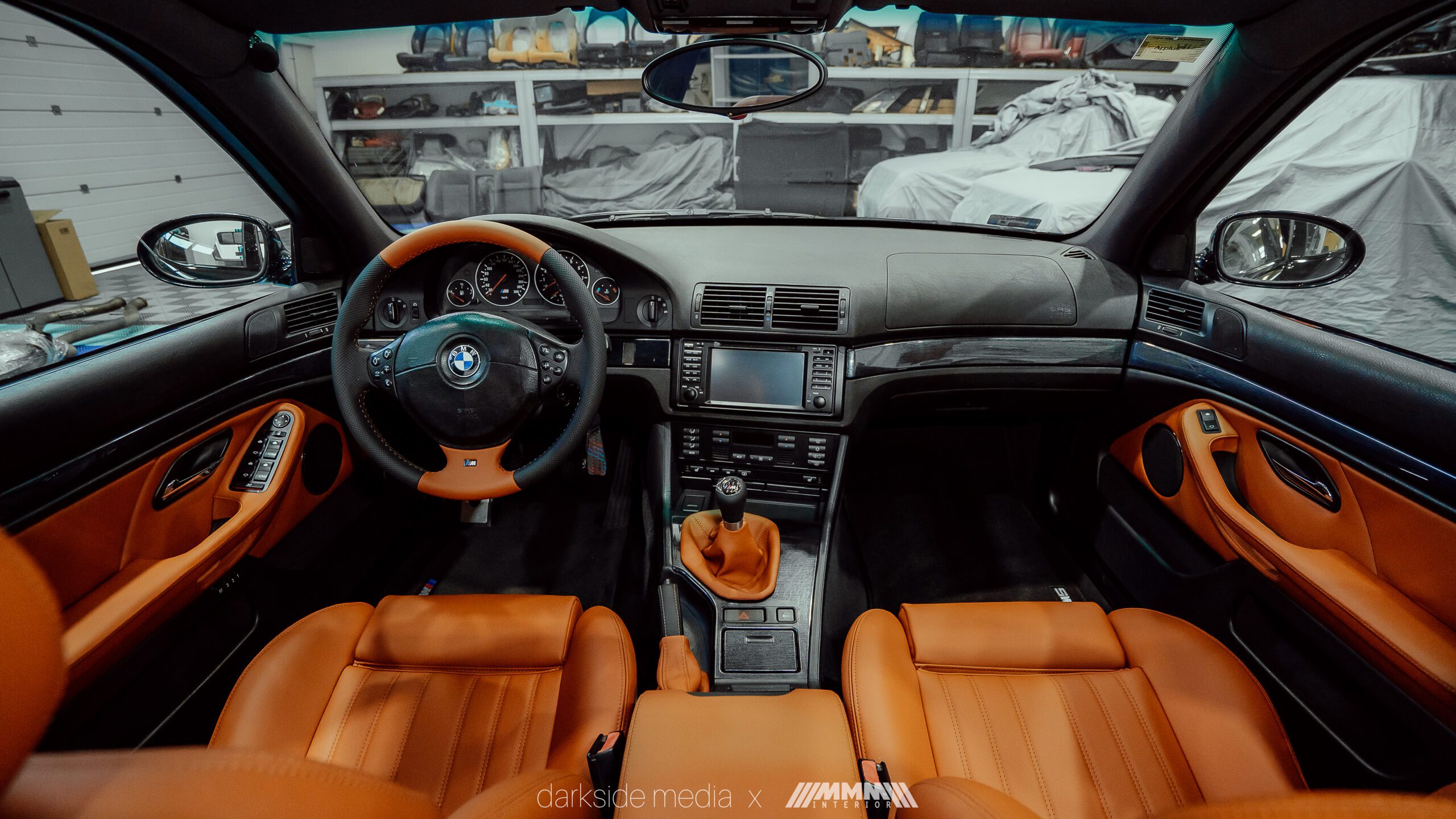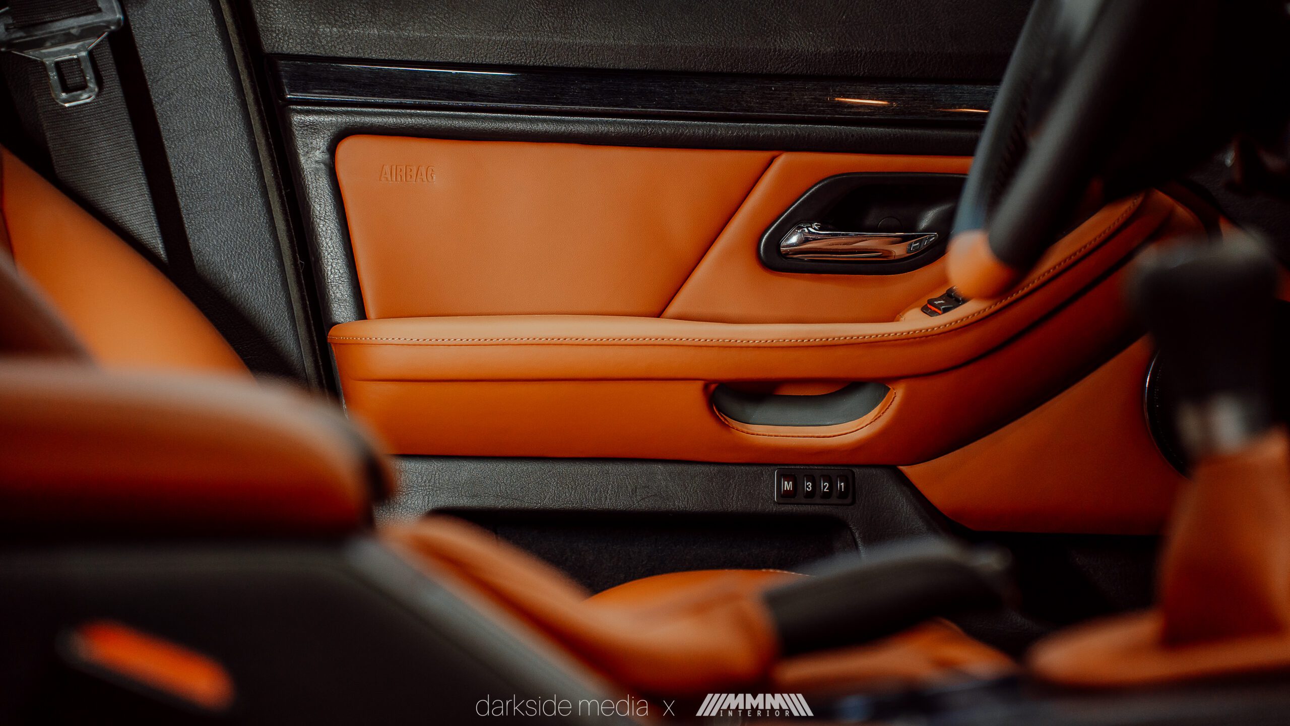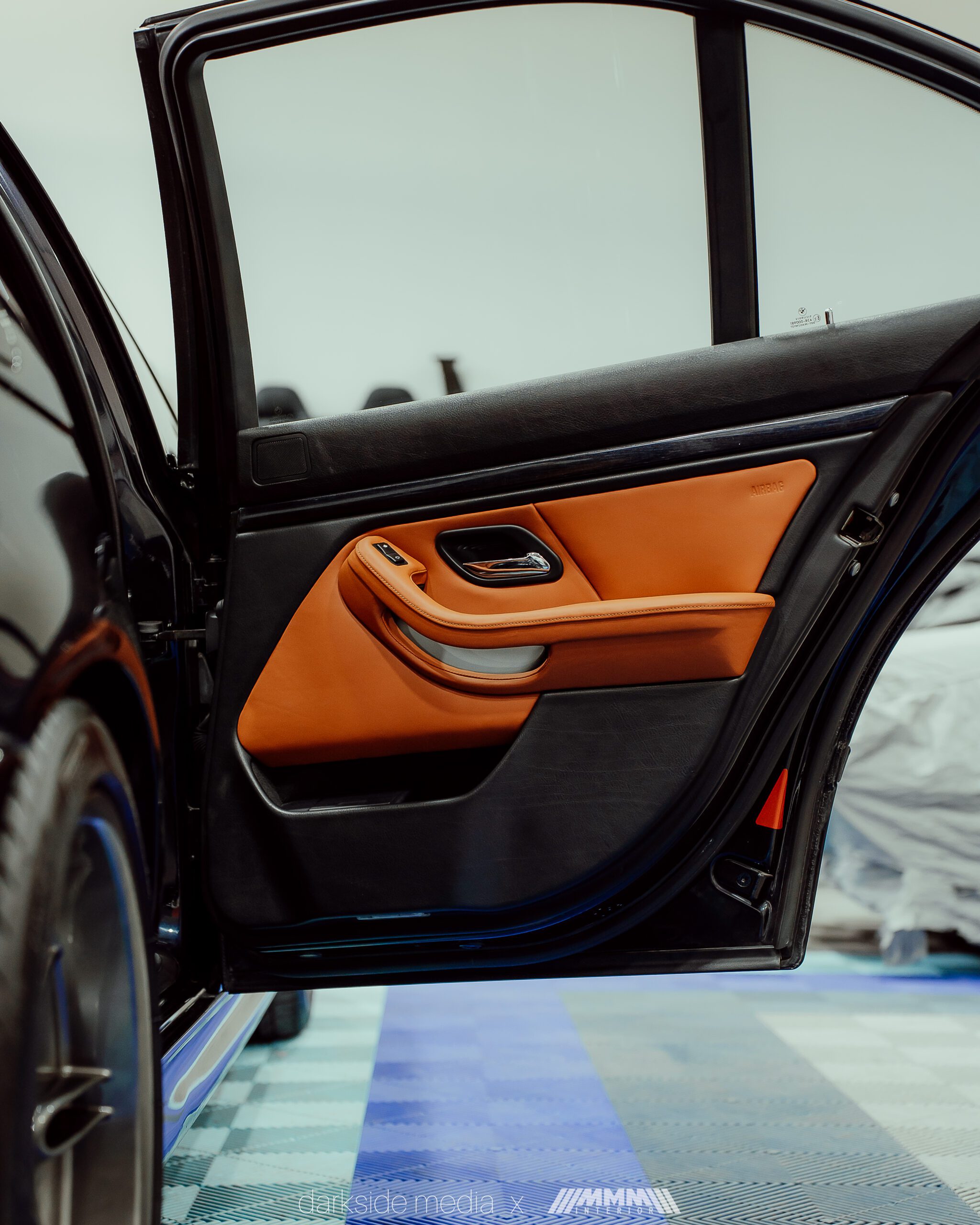 A carbonschwarz gyári fényezéssel tökéletesen harmonizál a gyári fahéj szín (természetesen nappabőr), de nem estünk túlzásba, azaz nem készült bővített bőrözés, “csak” az ülések, ajtókárpitok betétjei, a kormány és a váltózsák, könyöklő került újrabőrözésre. Sok apró típushibát is orvosoltunk egy teljes tisztítás mellett. Műszaki felújításon már átesett a gép, az utolsó lépés a fényezés korrekciója lesz, hogy egy újabb nagyon szép M5 kerüljön vissza az utakra.